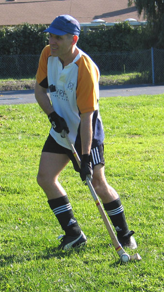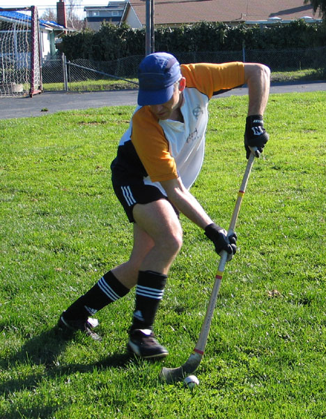 NOTE: Above you can see dribbling demonstrated with two variations of grip, showing right and left hand, respectively, as top hand. In the normal run of play it is better to keep your hands in the same orientation (right OR left as top hand), and slide the lower hand up and down the caman as play requires for different hitting and ball handling.