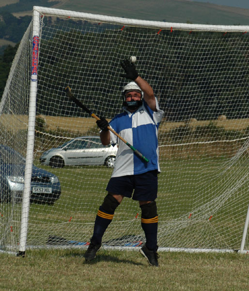 The goal-keeper (or just keeper) in Shinty has several unique challenges. He is guarding a goal that is 10 feet high and 12 feet wide, he must be proficient with his hitting and blocking, and and having quick reactions is a good thing too. The keeper in Shinty has no way to create a dead ball except to put the ball out of bounds (which is legal) and either cede a corner (by putting it over the end line), or a shie (putting it over the touch or side line).